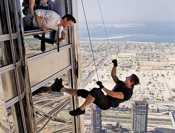4편에선 위에 언급했듯이 직접 두바이의 최대 고층빌딩인 부르즈 할리파를 맨손으로 등반하는 장면과 5편에선 시작부터 비행기 외부 문짝에 매달린채 영화를 시작한다. 매 시리즈마다 등장하는 자동차 추격씬이 있는데 시리즈 중 가장 볼거리가 많은 추격씬은 5편에서 등장한다. 6편의 halo점프와 7편의 오토바이 자유낙하 장면까지 영화는 상징적인 장면과 볼거리로 늘 흥행과 평가 앞에 성공적이다.